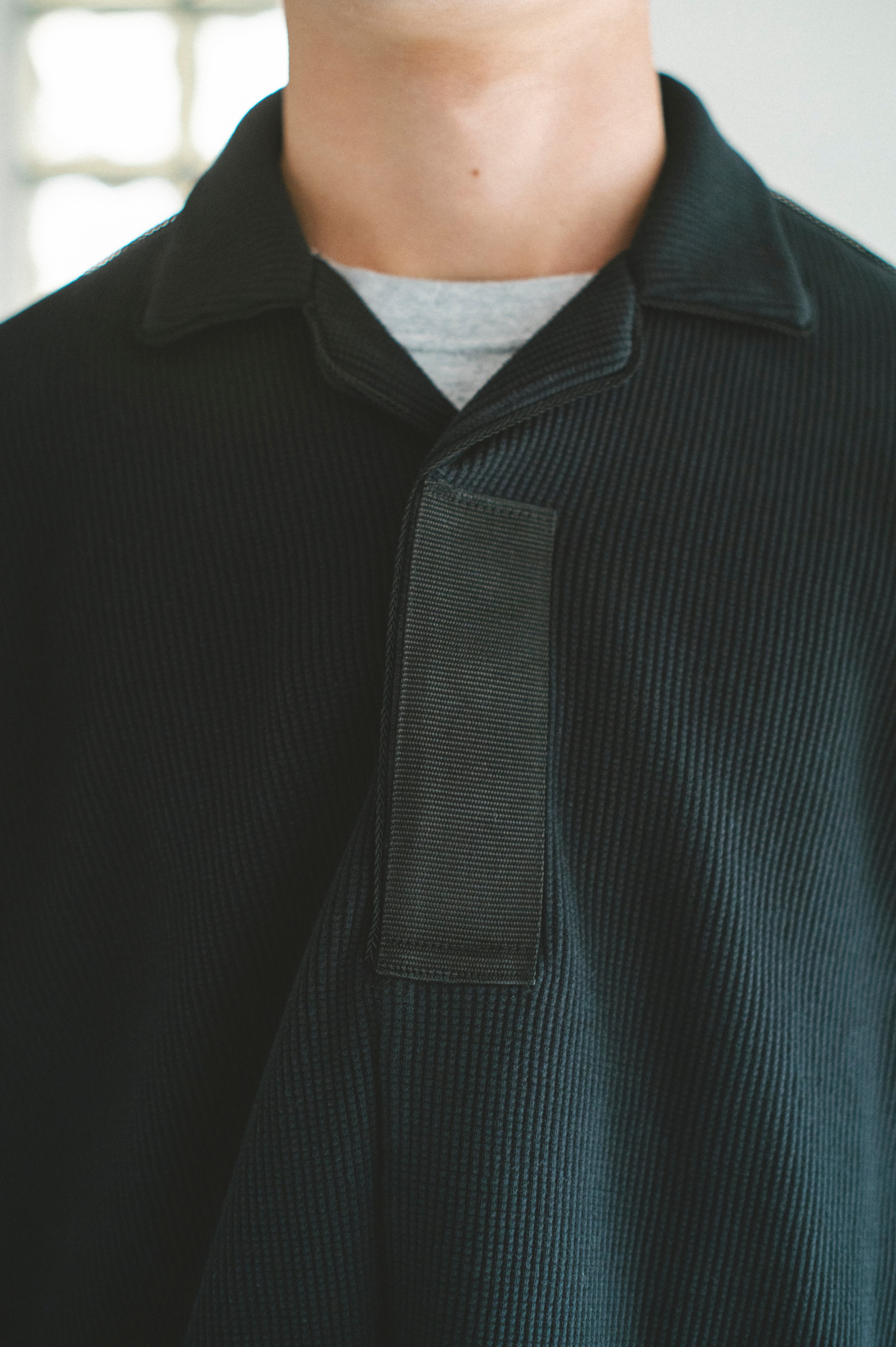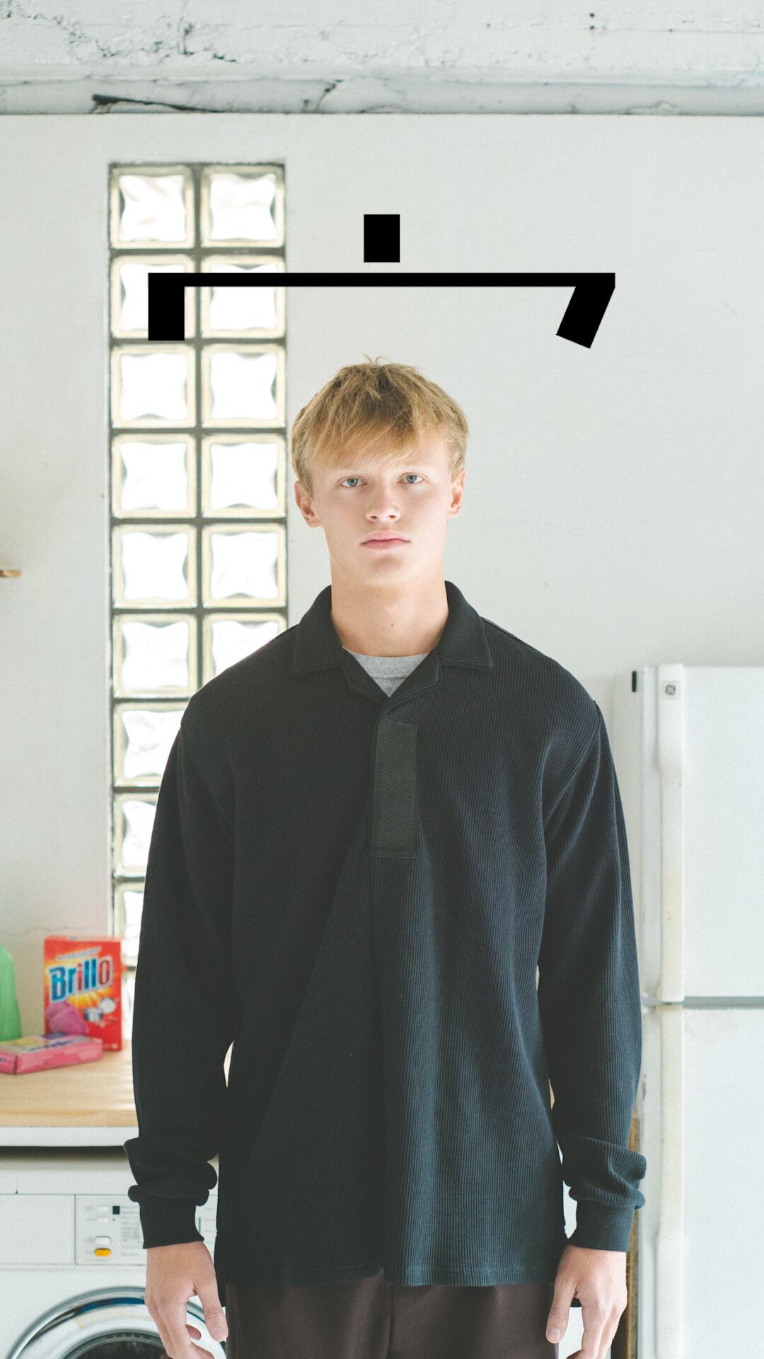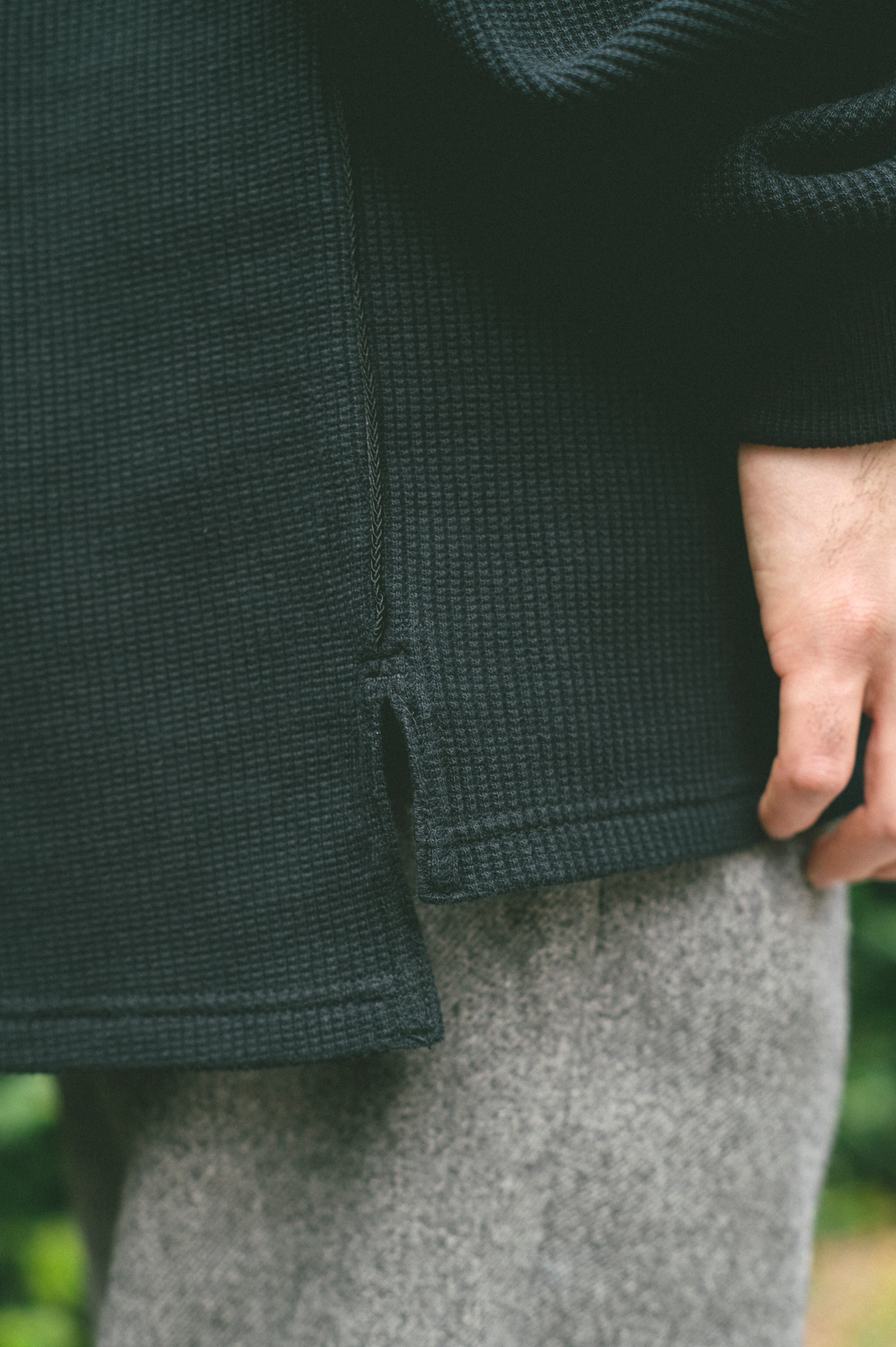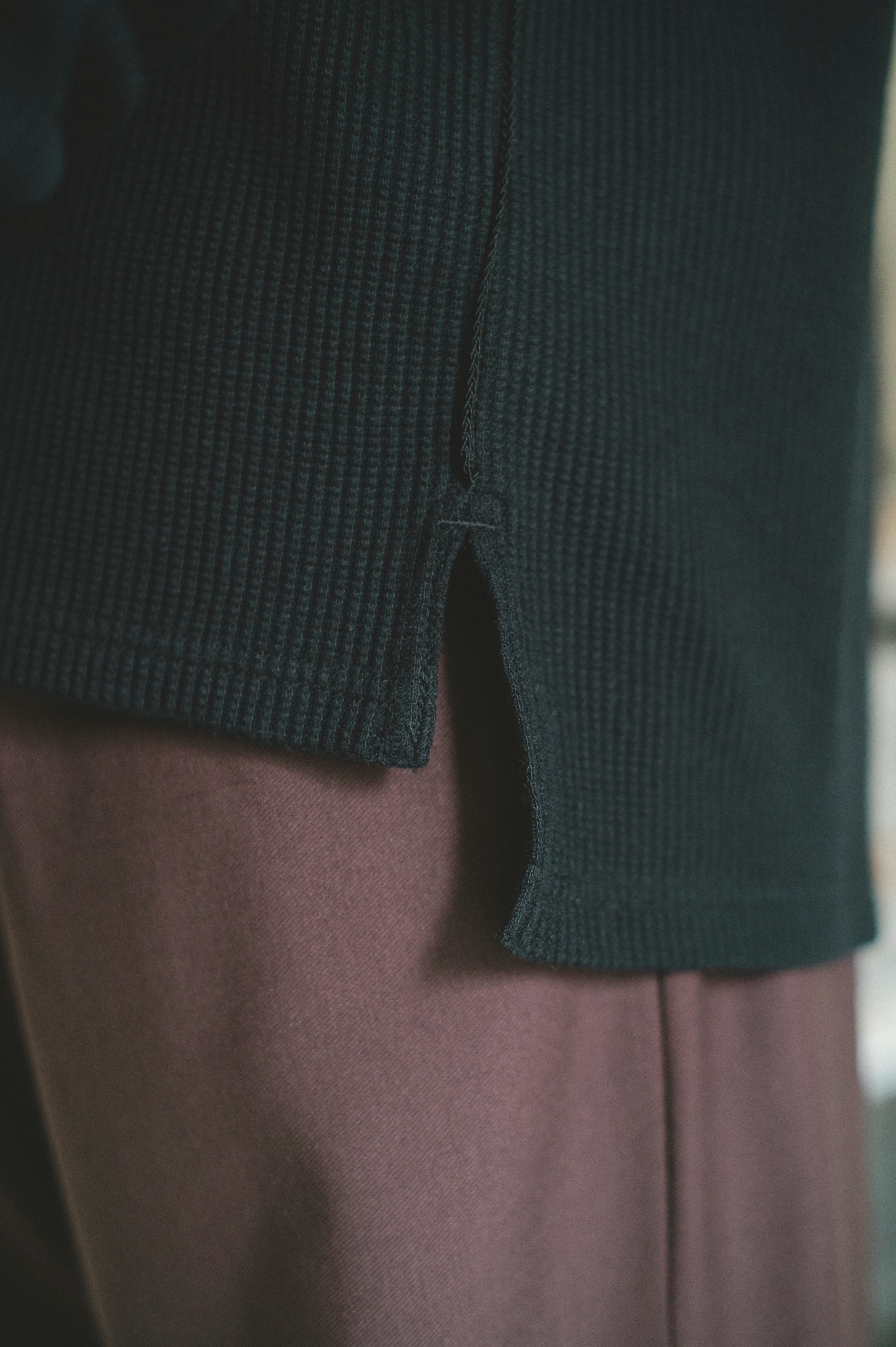 ワッフル素材にストレッチを持たせる事はあまりなかったですが、特殊な編み機で編み立てることで高いストレッチ性を実現しました。それによってヨレにくくもなっております。首回りを少し広めに取っているため、ゆったりとした着心地を実現。インナーで差し色を見せるのもおすすめです。