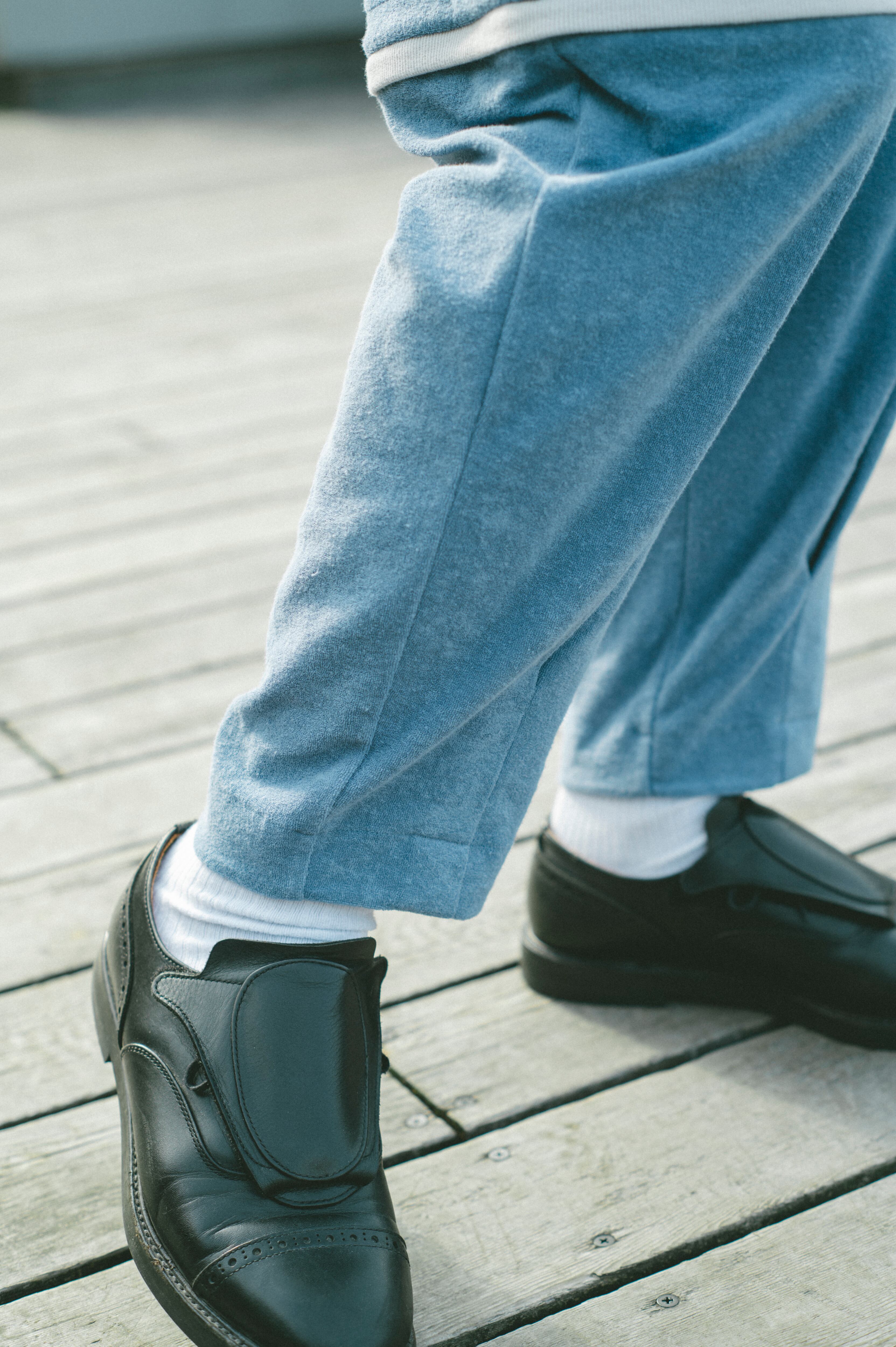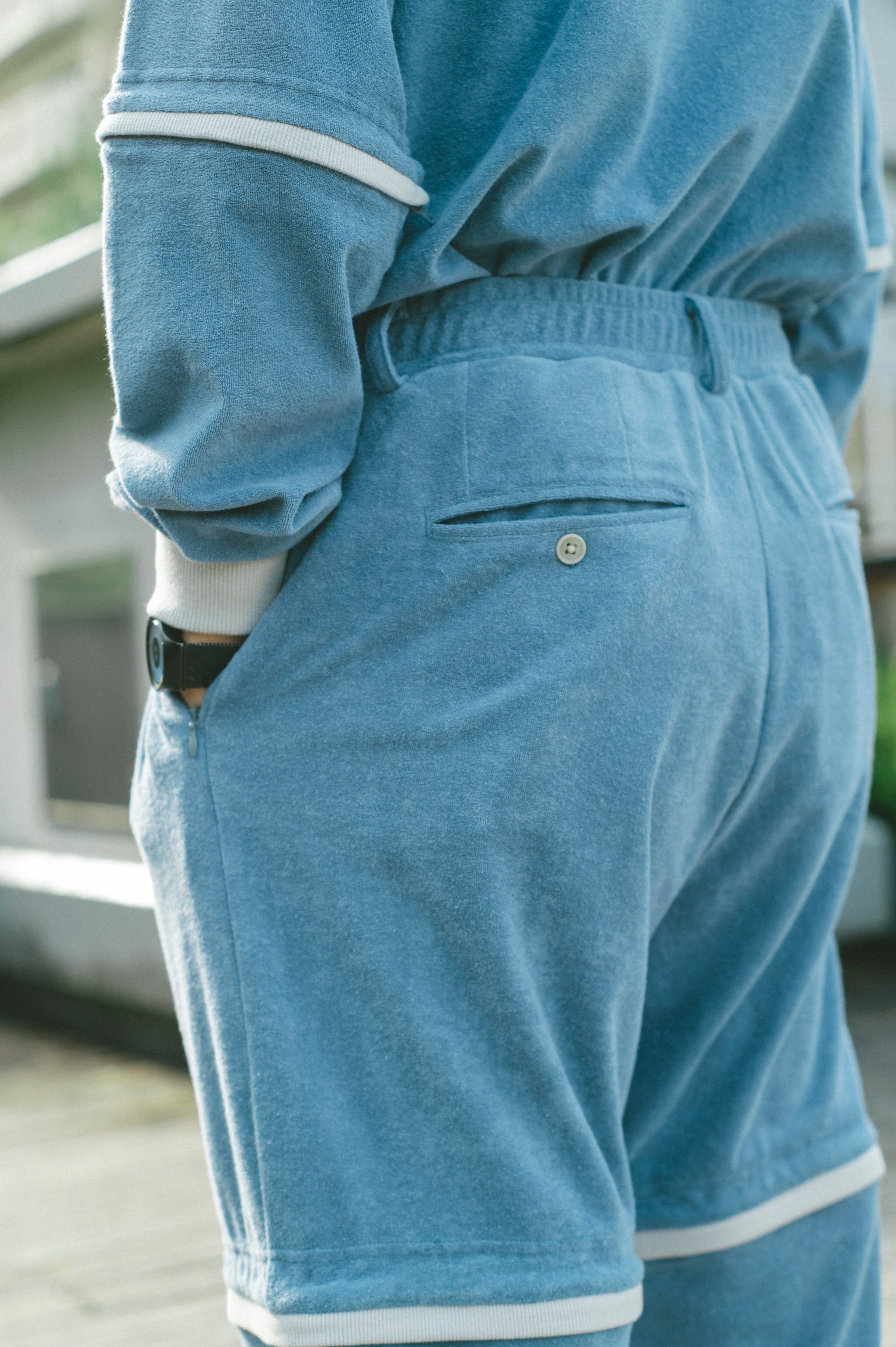 取り外し可能なので半ズボンとしてもお使い頂けます。適度なストレッチがあるパイル地なので履き心地も抜群。若干丈は短めにしてますので靴下で遊びを入れるのもおすすめです。